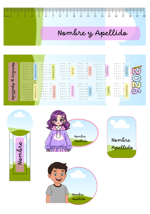 El kit incluye etiquetas de diferentes tamaños, ideales para cuadernos, carpetas, libros, útiles y materiales escolares. Además, cuenta con abecedarios, tablas, horarios y muchos recursos más que acompañan el trabajo diario de docentes y estudiantes.